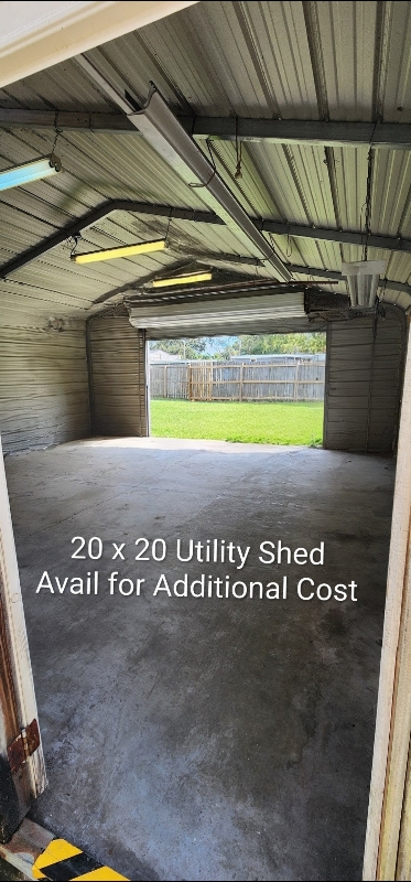 - 20'x20' utility shed with roll-up door & electricity. Perfect for tools, hobbies, storage.